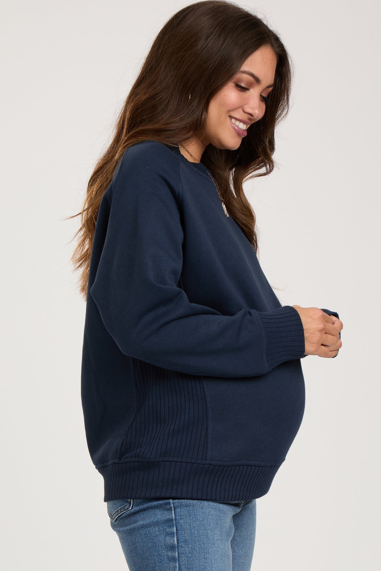A solid maternity terry crewneck featuring long sleeves and a rounded neckline.