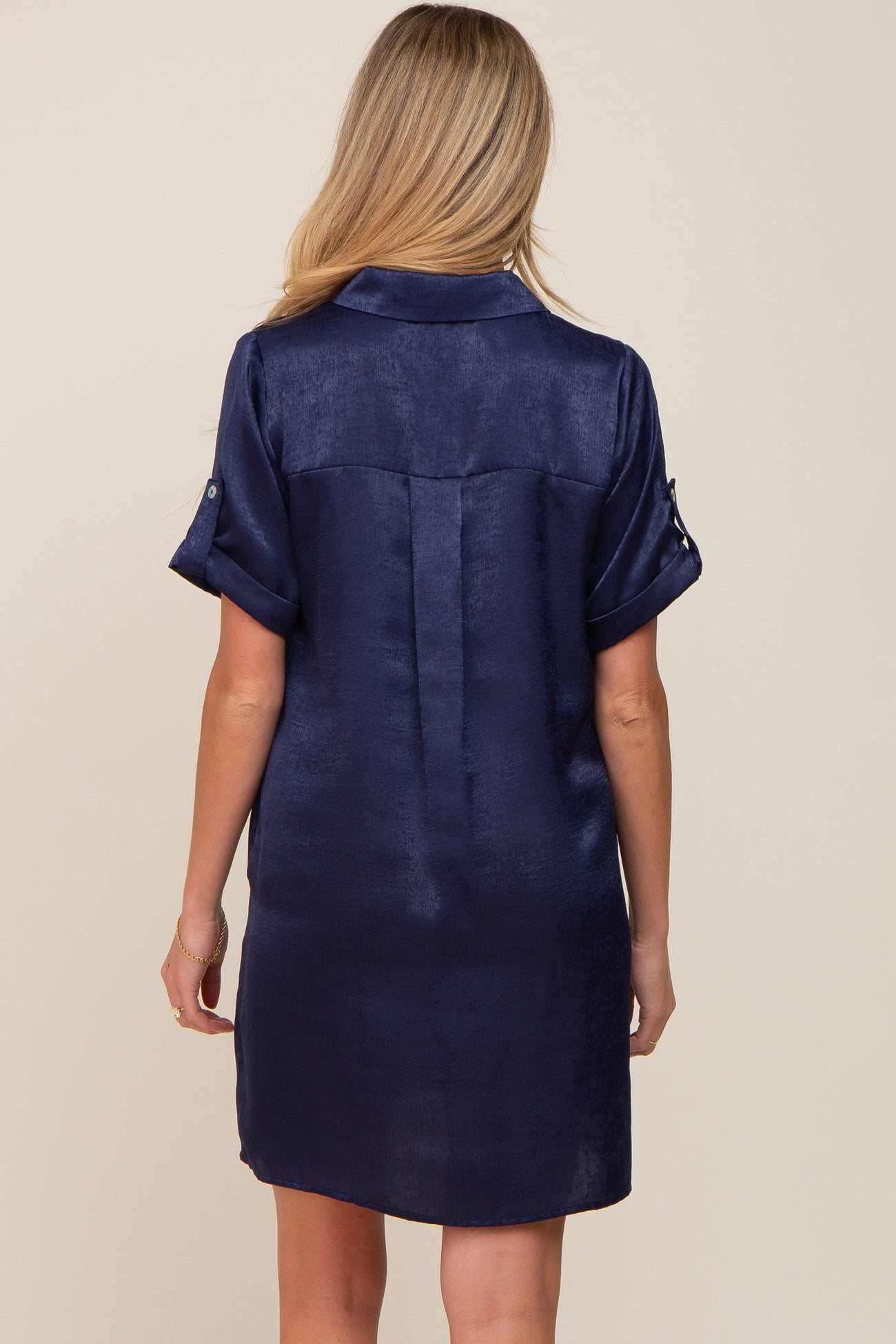 Navy Blue Satin Button Front Short Sleeve Maternity Dress