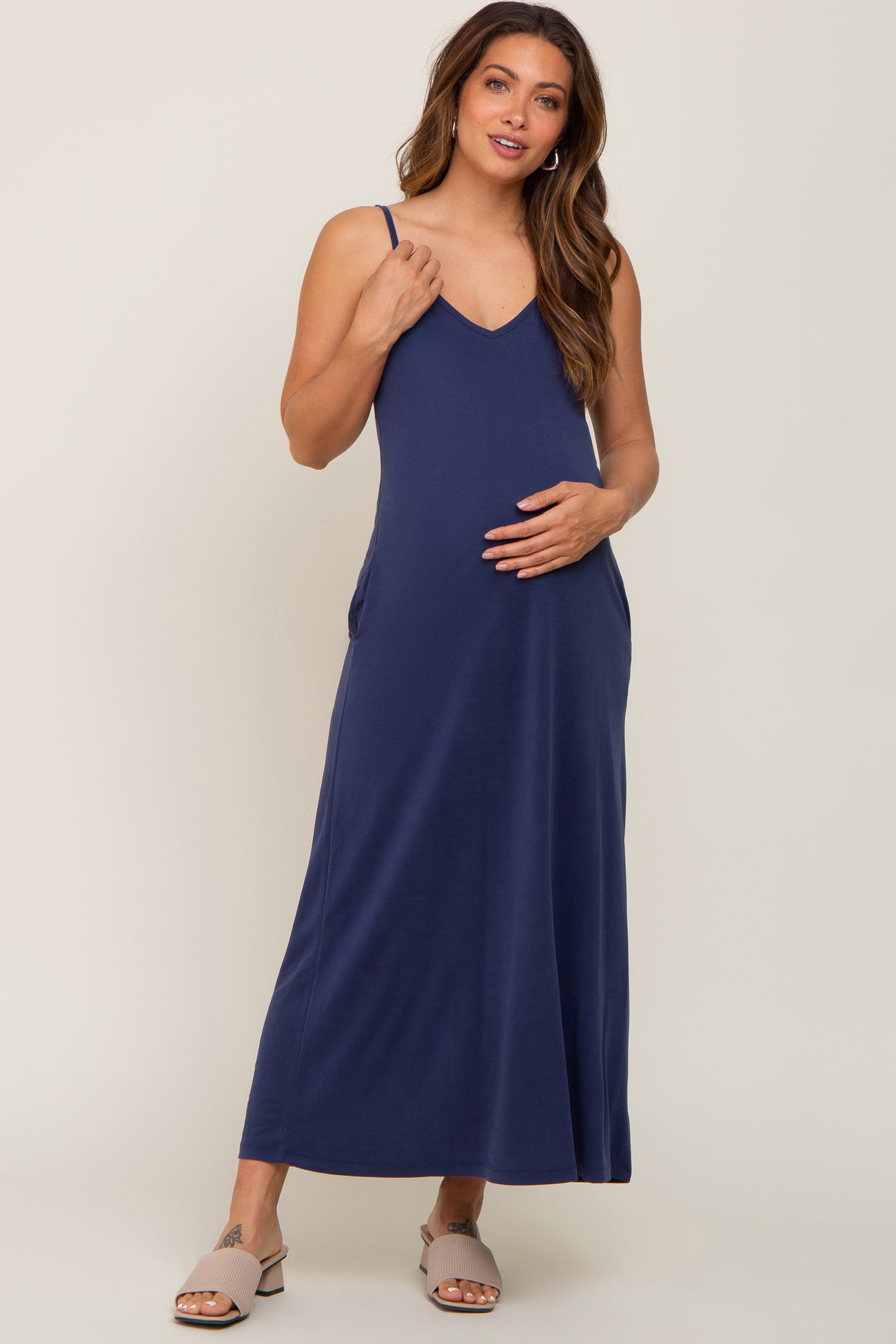 A solid knit maternity maxi dress featuring a v-neckline, adjustable cami straps and side pockets.