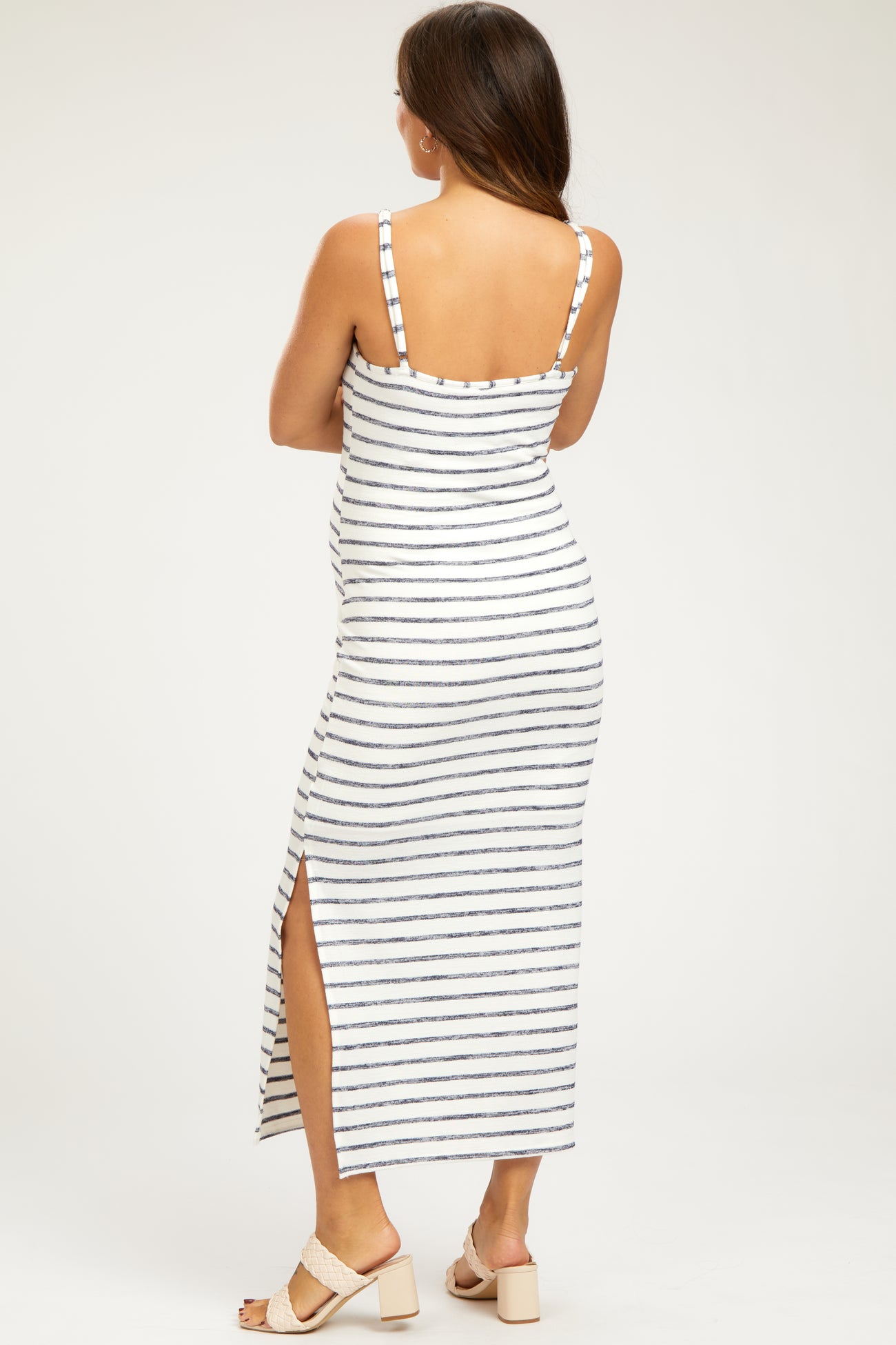 Navy Blue Striped Knit Side Slit Sleeveless Maternity Midi Dress
