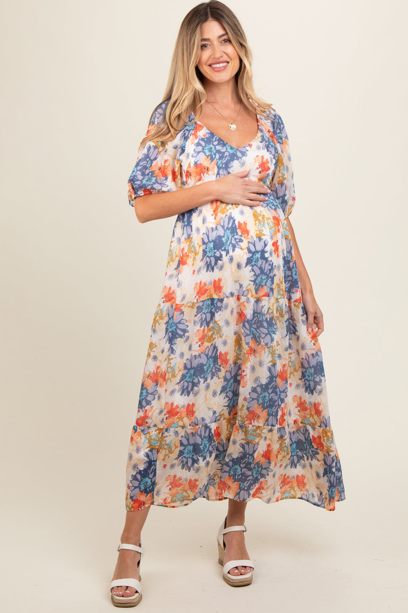 Navy Blue V-Neck Short Puff Sleeve Tiered Maternity Midi Dress