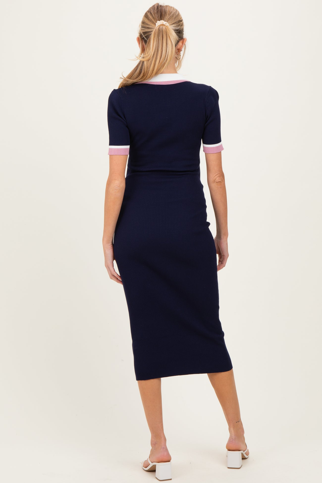 Elevate your maternity wardrobe with this chic collared midi dress designed to comfortably embrace your growing bump. Crafted from a soft, ribbed knit fabric, it offers gentle stretch and support while maintaining a flattering silhouette. The dress features a classic collar and short sleeves with subtle colorblock detailing at the cuffs and neckline for a stylish finish. Its midi length adds versatility, making it perfect for casual days or dressed-up occasions. Easy to wear and care for, this dress combines comfort and elegance for every stage of your pregnancy.