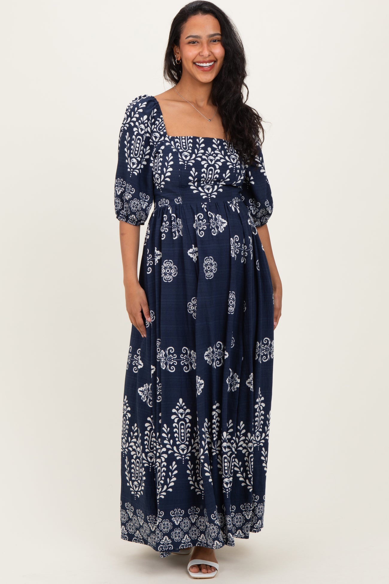 Navy Damask Print Short Sleeve Maternity Maxi Dress