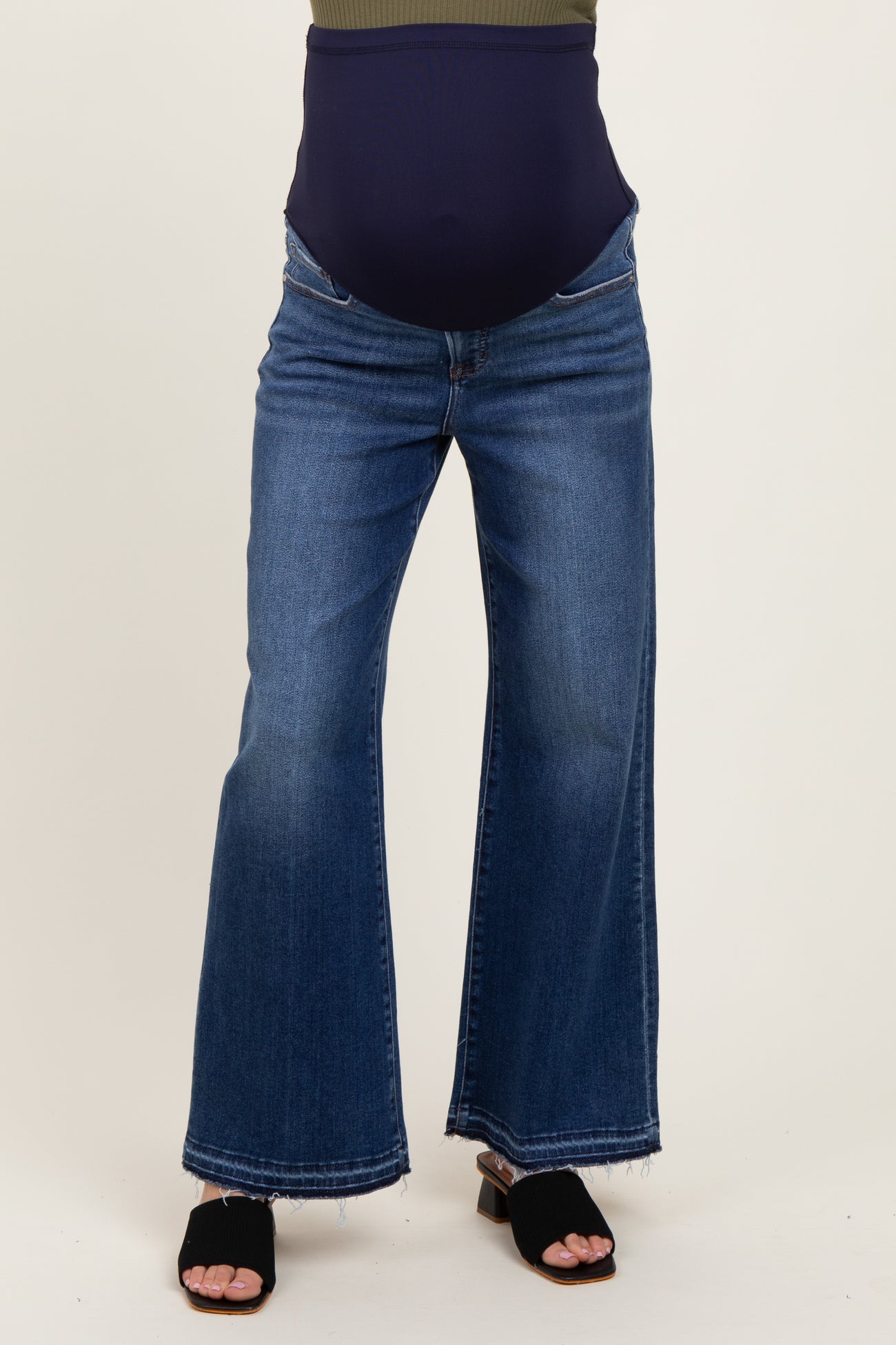 Navy Distressed Raw Hem Wide Leg Maternity Jeans