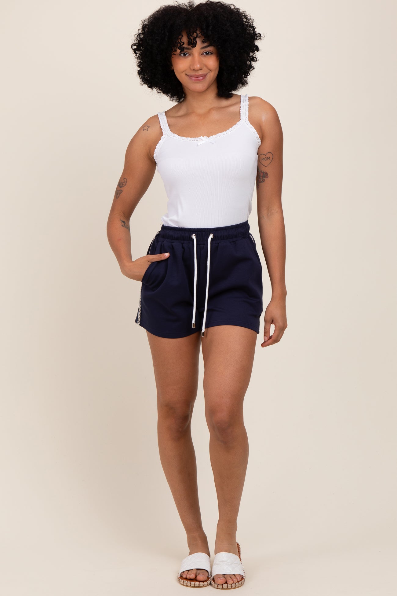 Navy Drawstring Chevron Embroidered Maternity Shorts