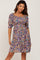 A floral print dress featuring a squared neckline, short cinched sleeves, and an elastic waist.