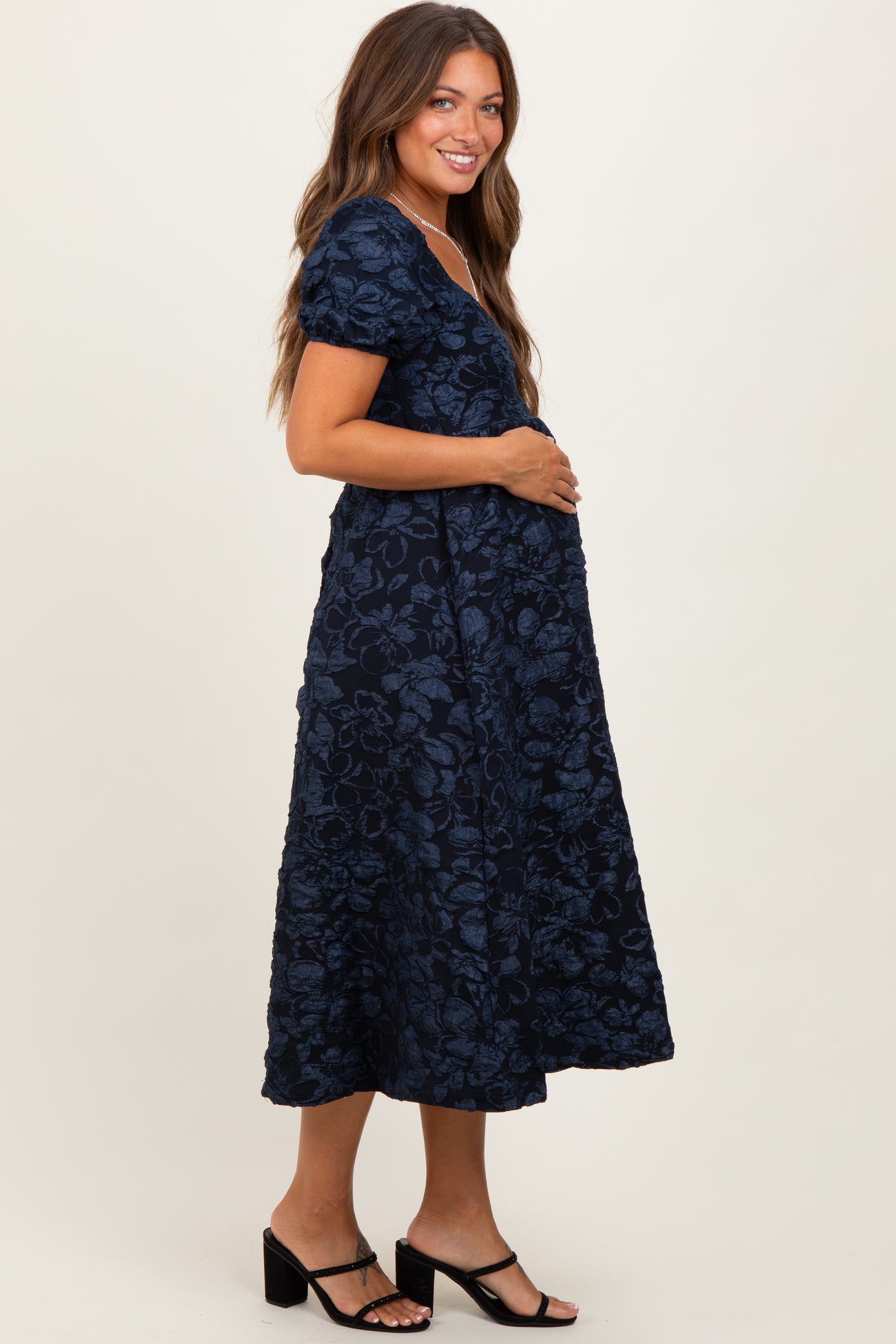 Navy Floral Jacquard Puff Sleeve Maternity Midi Dress