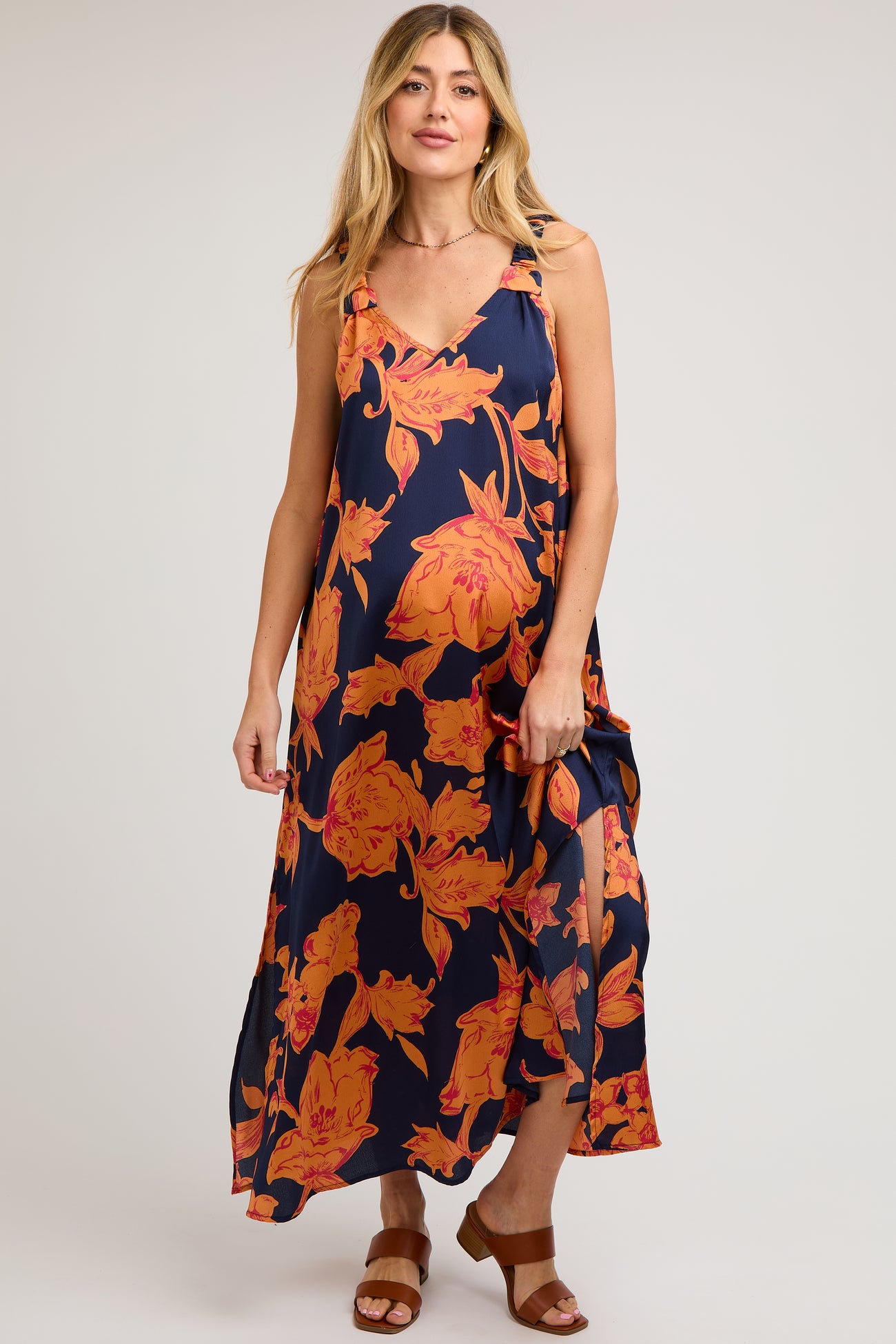 Navy Floral Ruched Strap V-Neck Maternity Midi Dress