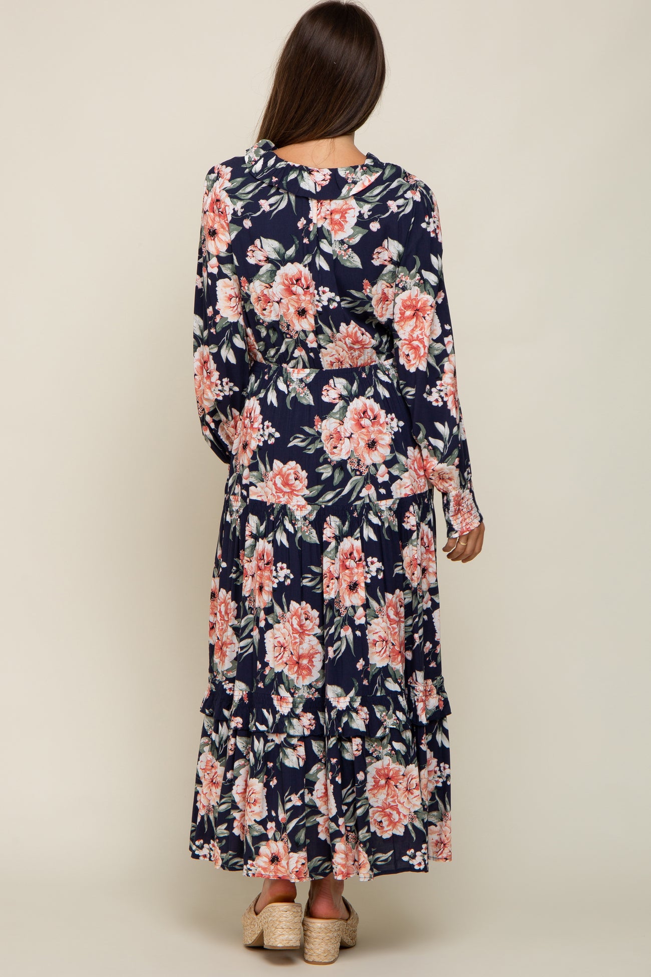 Navy Floral Smocked Ruffle Neck Maternity Maxi Dress