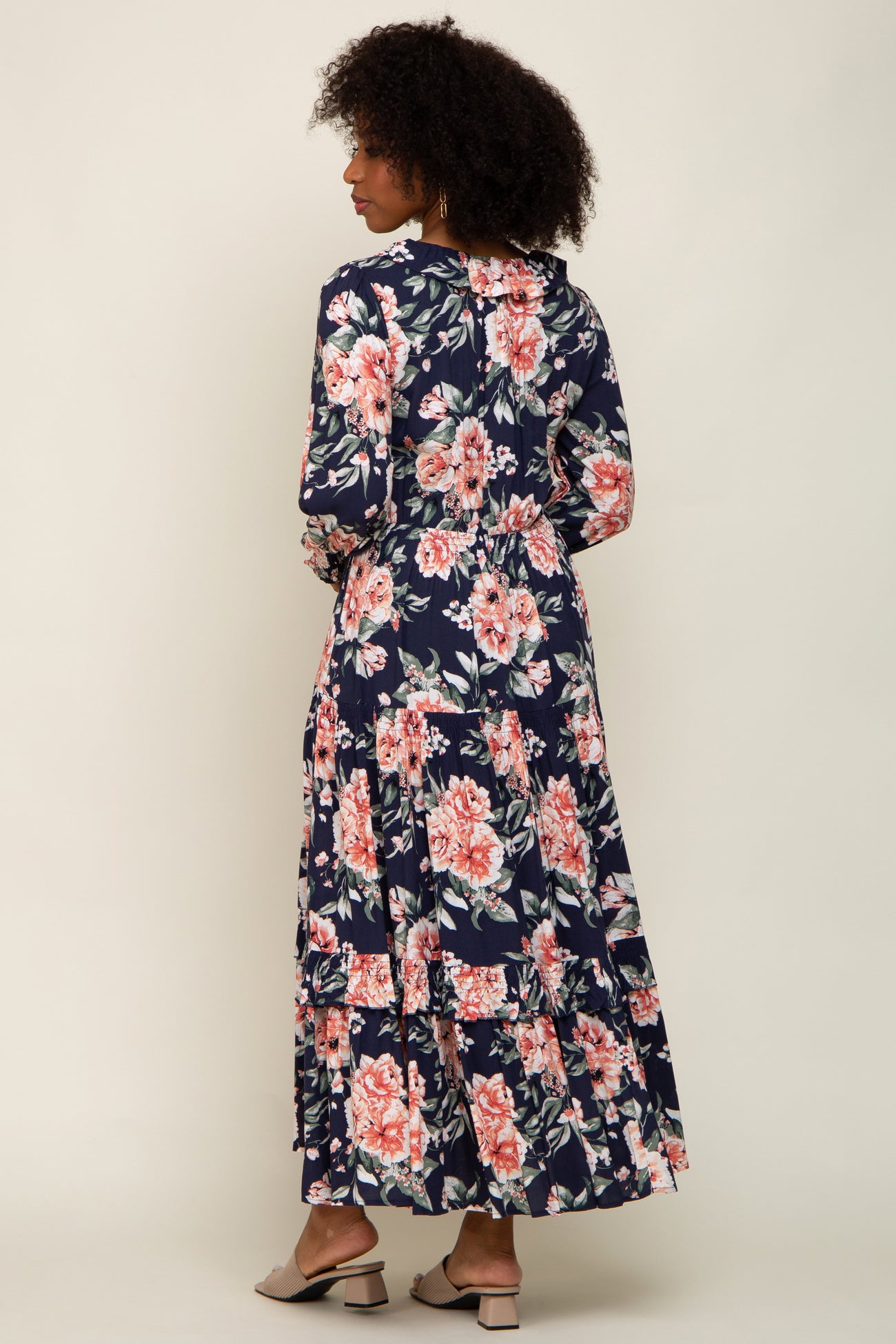 Navy Floral Smocked Ruffle Neck Maxi Dress