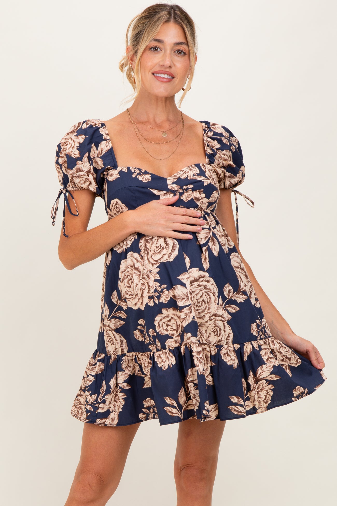 Embrace elegance and comfort with our Navy Floral Sweetheart Neckline Maternity Mini Dress. Crafted with soft, breathable fabric, this dress features a flattering sweetheart neckline and puff sleeves with adjustable ties for a customizable fit. The beautiful navy base adorned with delicate beige floral prints adds a touch of timeless charm. Designed to accommodate your growing bump, its empire waist and flared hem create a graceful silhouette. Perfect for baby showers, casual outings, or date nights, this dress pairs effortlessly with sandals or heels for a chic maternity look. Celebrate your pregnancy in style!
