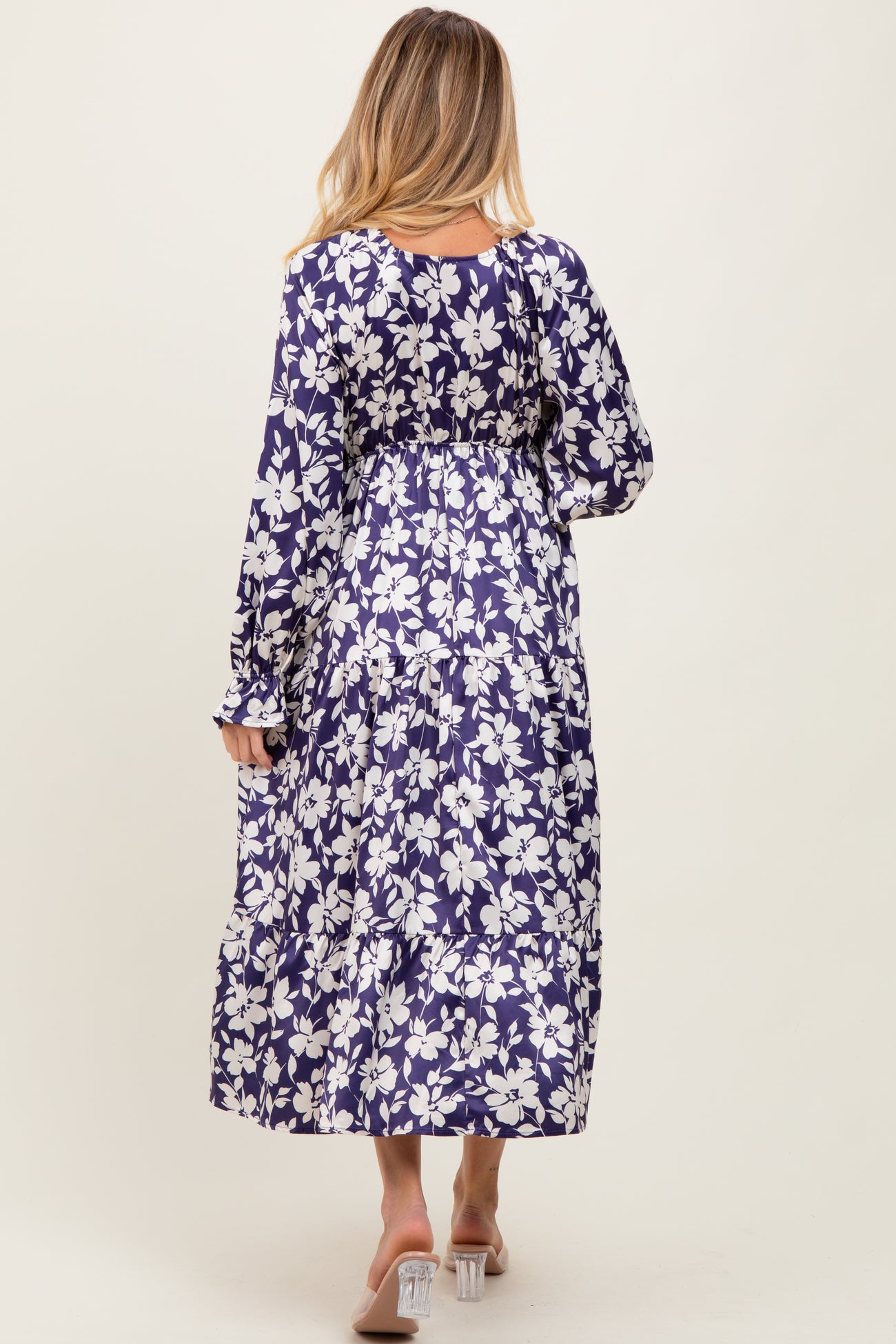 Navy Floral Tiered Ruched V-Neck Satin Maternity Maxi Dress