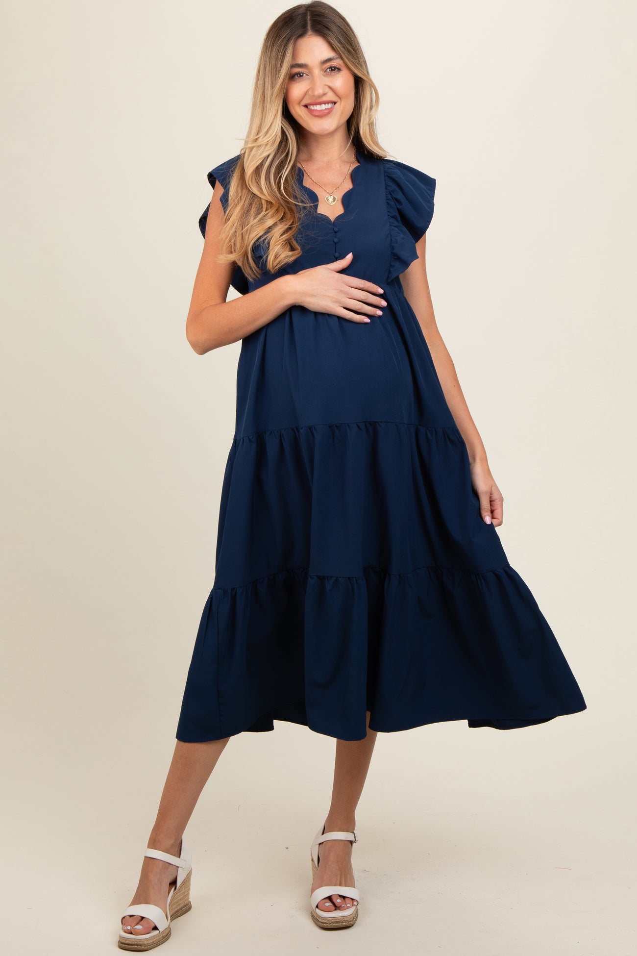 Navy Flutter Sleeve Tiered Maternity Midi Dress