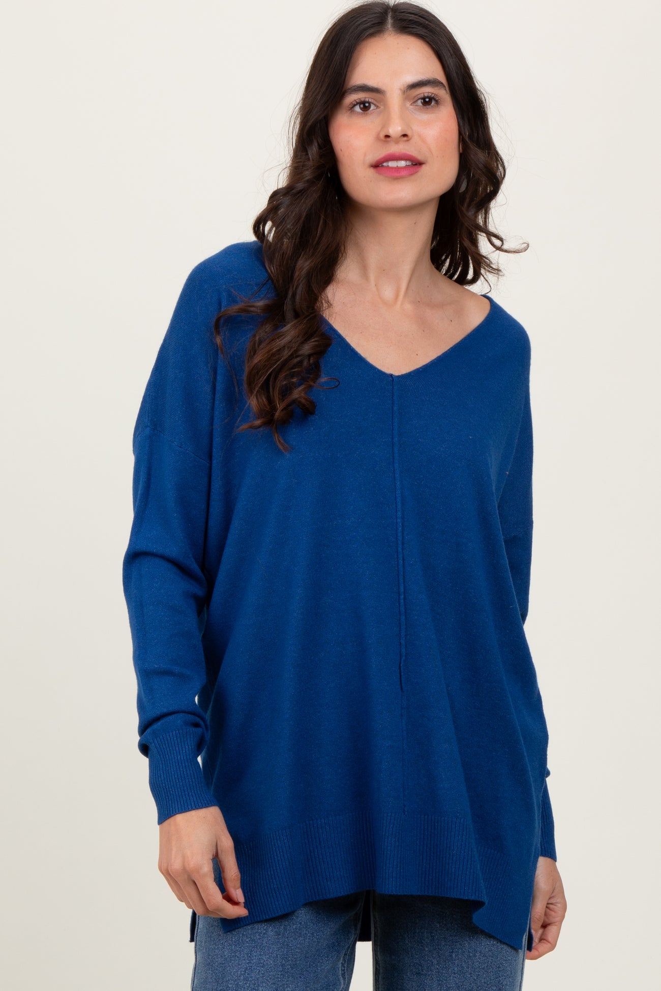 Navy Front Seam V-Neck Side Slit Sweater