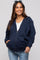 A solid hue maternity sweater featuring a front zipper closure, a drawstring hood, long raglan sleeves, and side pockets. Fleece lined.