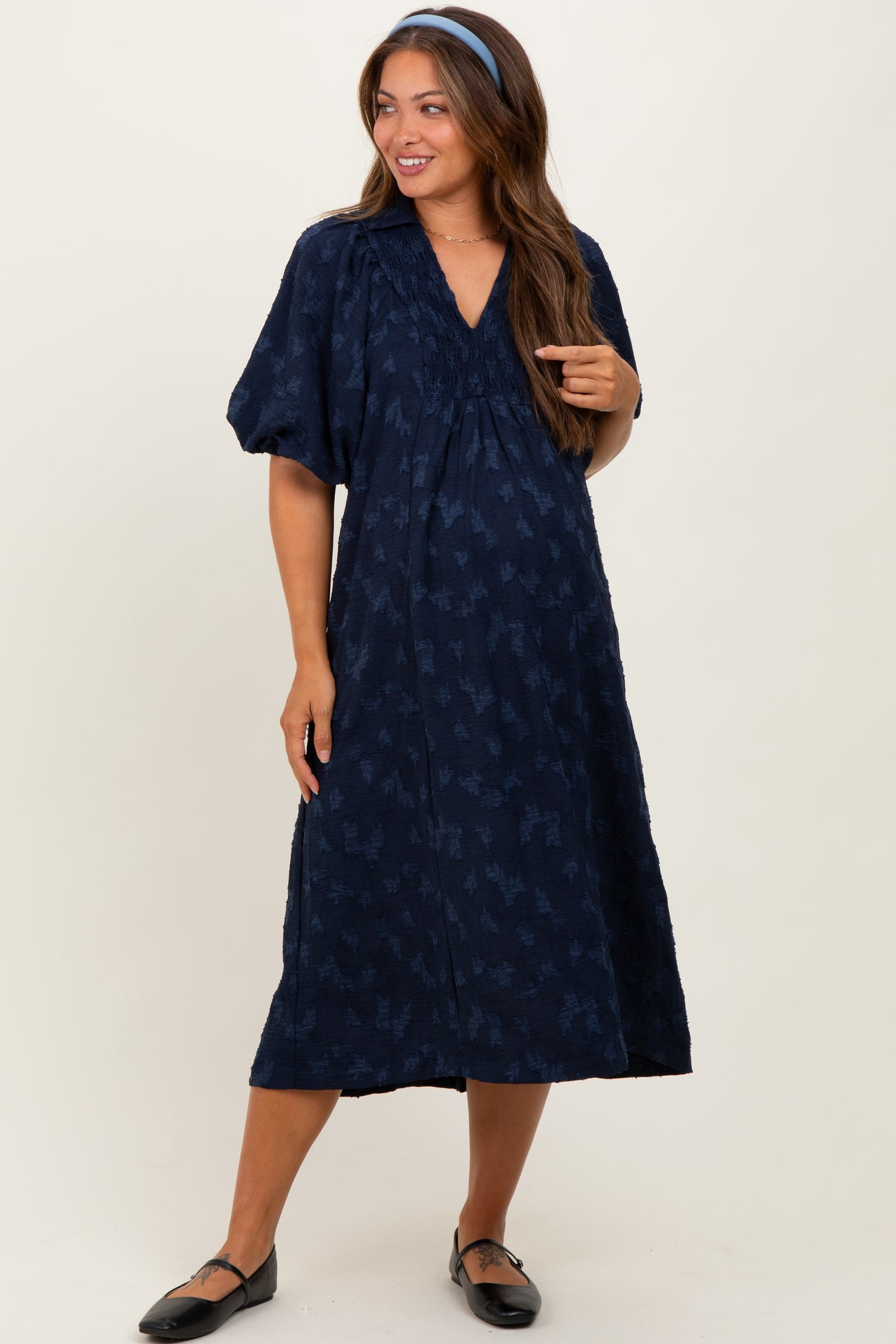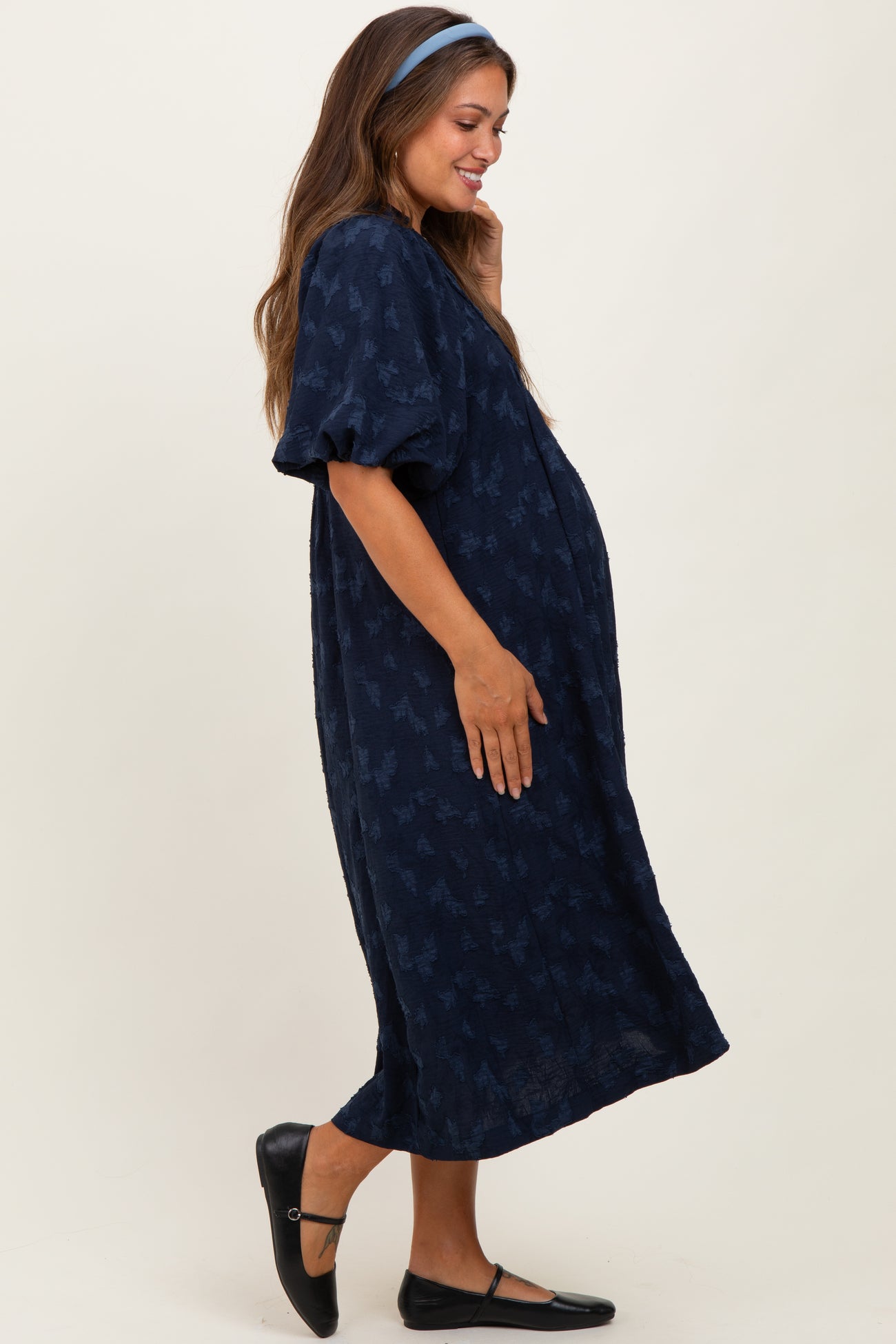 Navy Jacquard Texture V-Neck Maternity Midi Dress