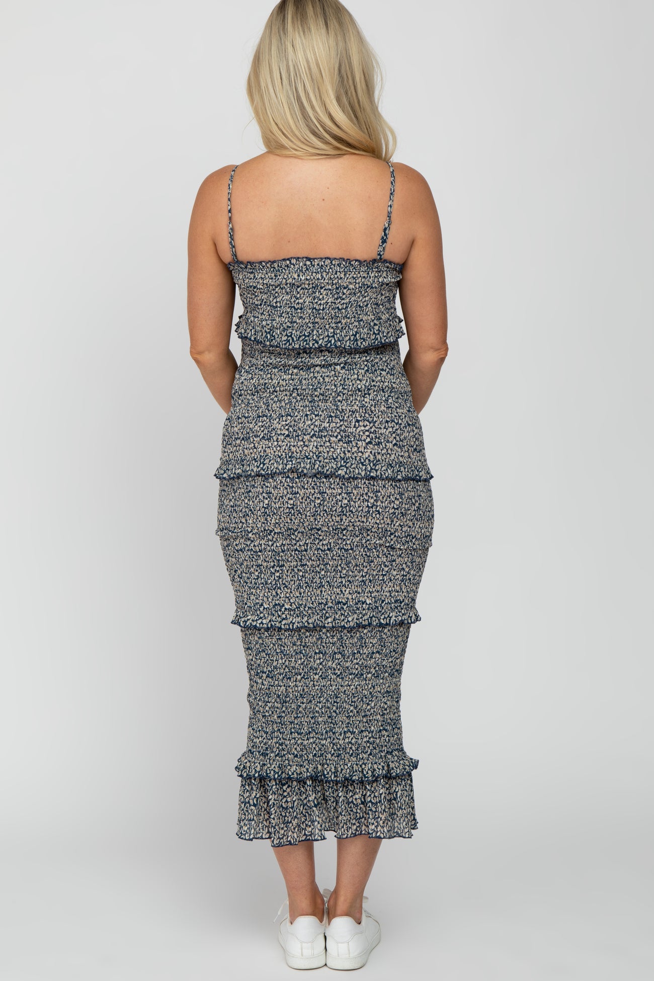 Navy Leaf Print Smocked Fitted Maternity Midi Dress
