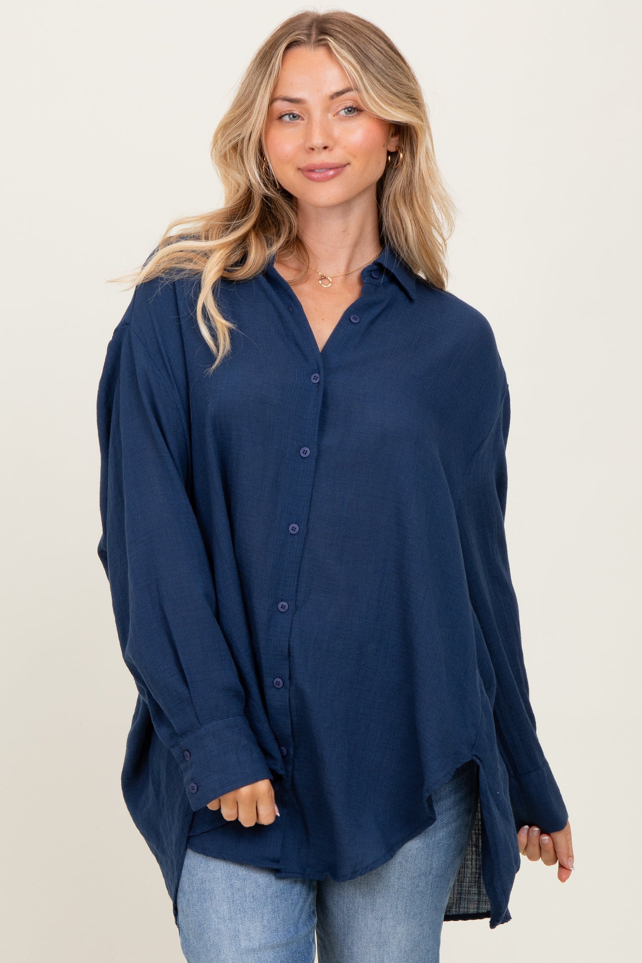 Elevate your casual wardrobe with our Navy Lightweight Sheer Button Down Blouse. Crafted from breathable, airy fabric, this blouse offers a relaxed, oversized fit that's perfect for layering or wearing on its own. The sheer texture adds a soft, feminine touch while the classic button-down design and collar keep it effortlessly chic. Featuring long sleeves with button cuffs and a slightly curved hem for a flattering silhouette, this versatile piece pairs beautifully with jeans or skirts for day-to-night style. Embrace comfort and sophistication in one stylish blouse. Perfect for warm weather or layering year-round.