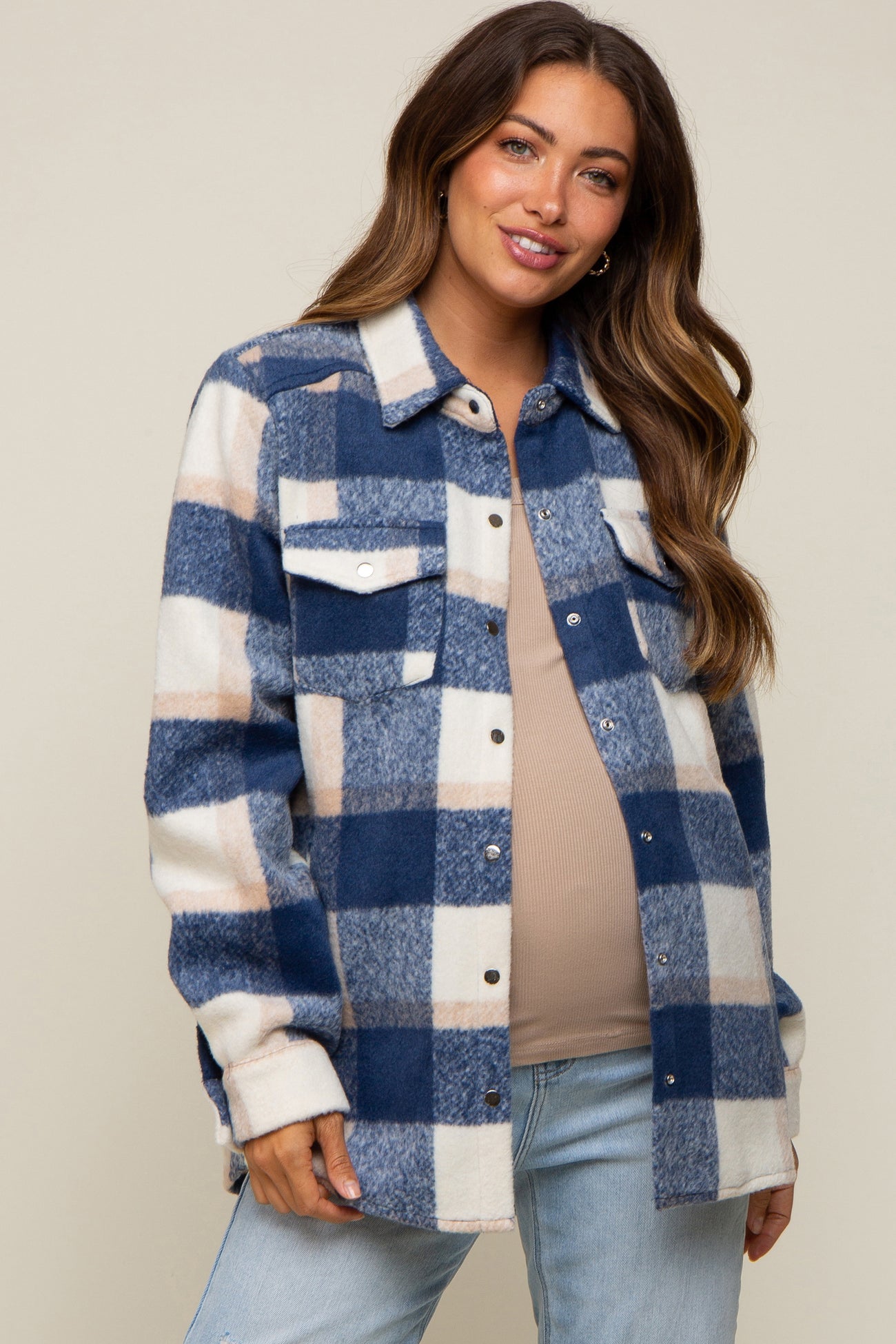 A plaid print maternity shirt jacket with a collared neckline, snap button front closure, and two side pockets.