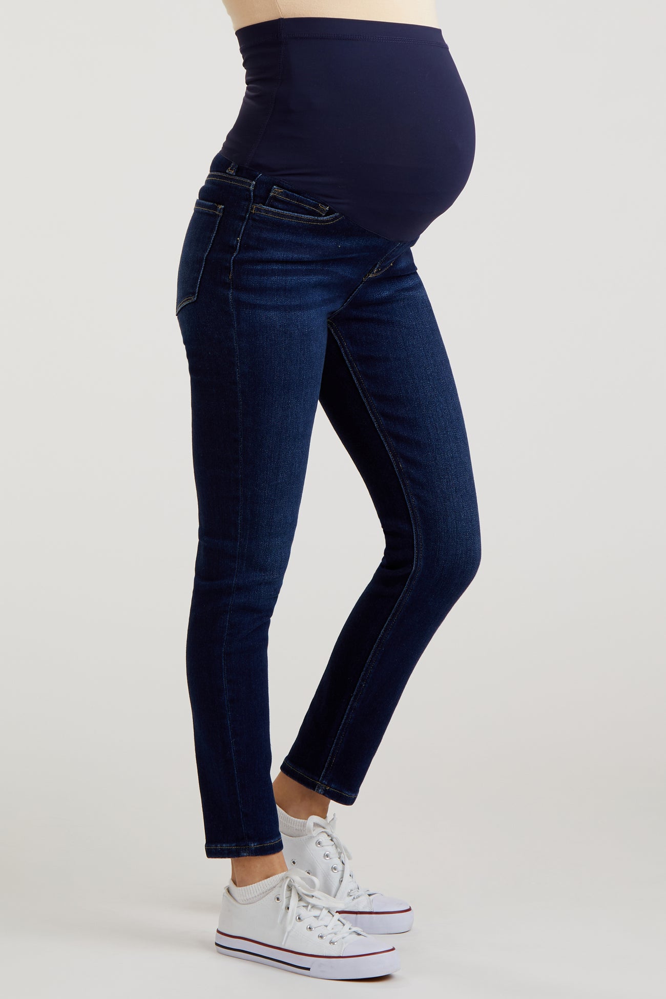 A pair of dark maternity jeans with 5 pockets, skinny legs, and an elastic belly band.