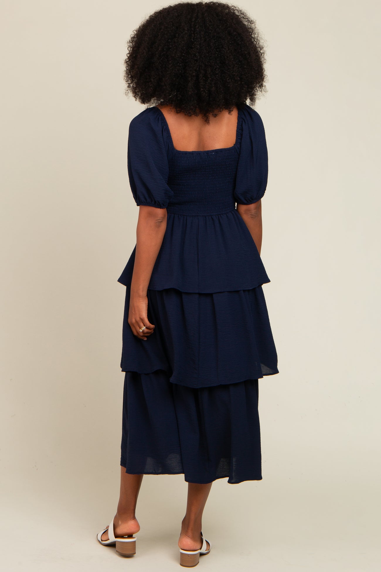 Navy Smocked Body Ruffled Tiered Midi Dress