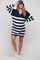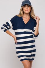 A striped maternity sweater dress with a v-neckline and long drop shoulder sleeves.