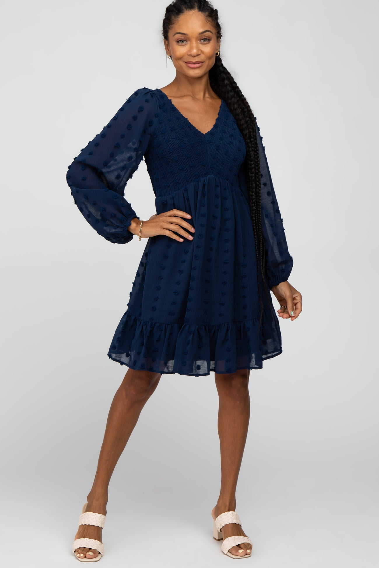 A swiss dot textured dress featuring a smocked bust and back, long sleeves, a v-neckline and a ruffle hem. Partially double lined.