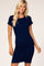 A t-shirt dress with a wrap hem and side ruching. This style runs small.