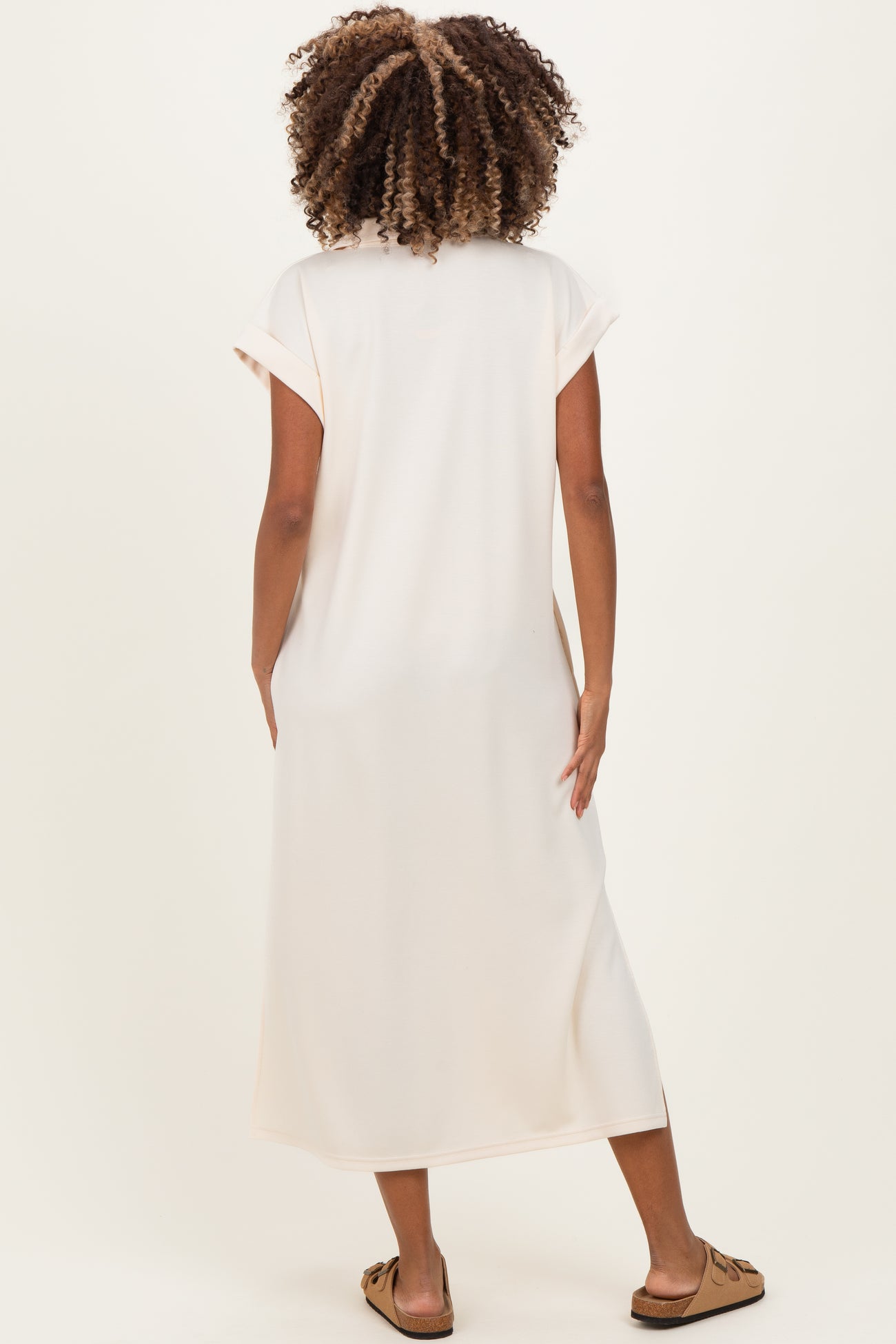 Experience effortless comfort and style with this collared oversized maternity midi dress. Crafted from a soft, breathable fabric, it features a relaxed fit that gracefully accommodates your growing bump. The dress offers short sleeves with rolled cuffs, side pockets for convenience, and side slits that add a touch of ease and movement. Perfect for casual days or dressing up with your favorite accessories, this versatile piece is a must-have for every mom-to-be looking for a chic yet comfortable wardrobe staple. Designed to keep you cool and confident throughout your pregnancy journey.