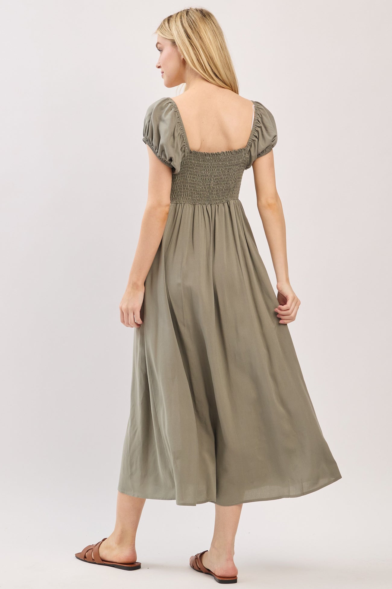 Olive Button Accent Front Slit Midi Dress