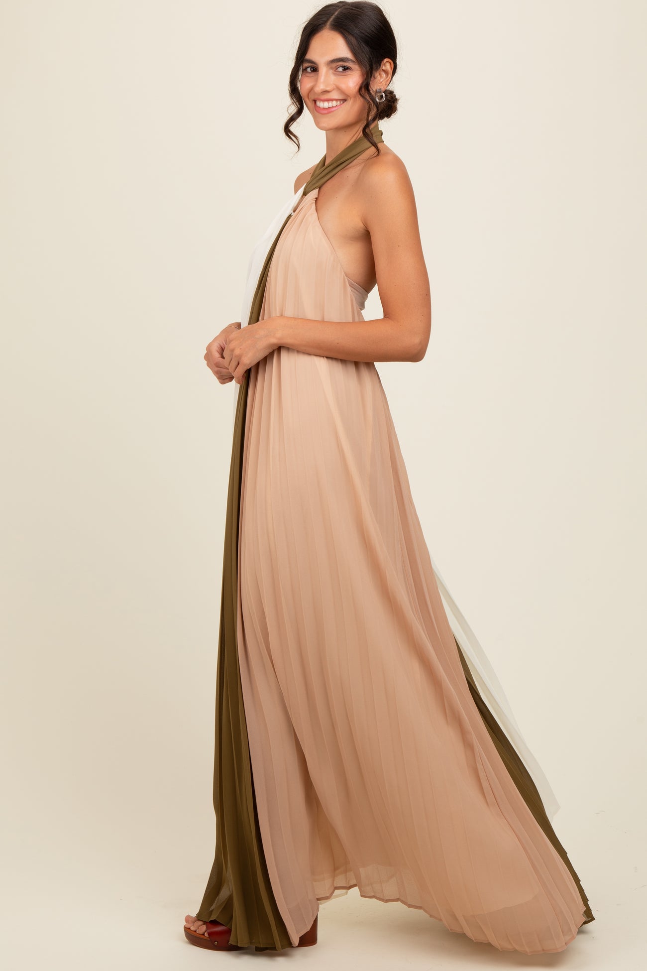 Olive Colorblock Pleated Halter Neck Maxi Dress