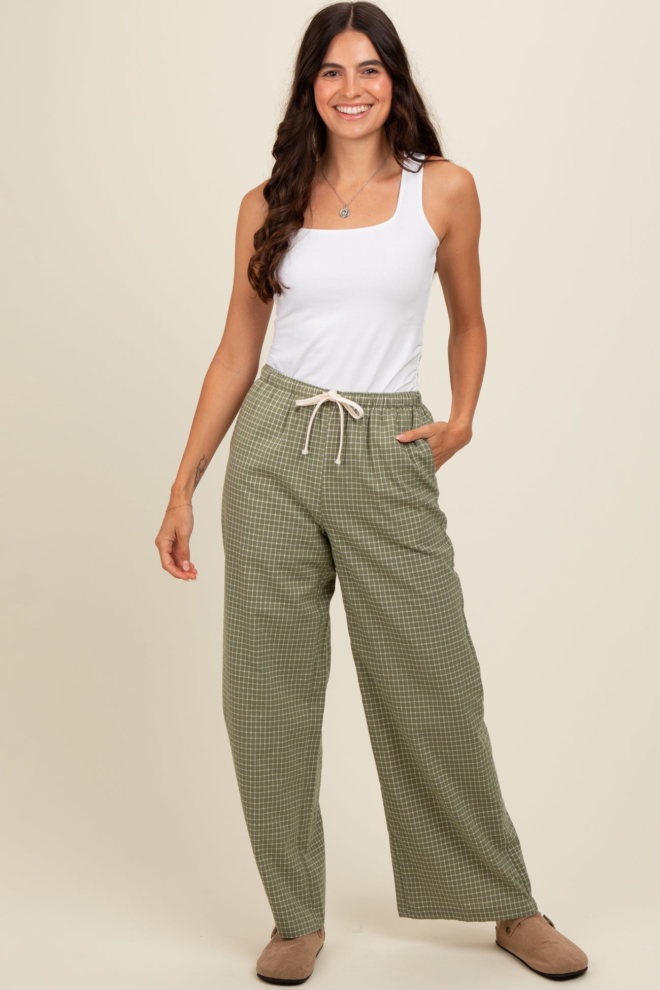 Elevate your casual wardrobe with these Olive Drawstring Checker Plaid Pants. Crafted from lightweight, breathable fabric, these pants offer all-day comfort with a relaxed fit. The olive green color with subtle white checkered pattern adds a chic, laid-back vibe. Featuring an adjustable drawstring waist and side pockets, they combine style with practicality. Perfect for lounging, running errands, or casual outings, pair them with a simple tank or tee for effortless style. Step into comfort and sophistication with these versatile plaid pants that blend fashion and function seamlessly.
