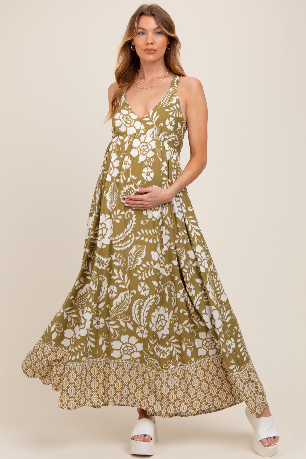 Olive Floral Crisscross Back Cutout Maternity Maxi Dress