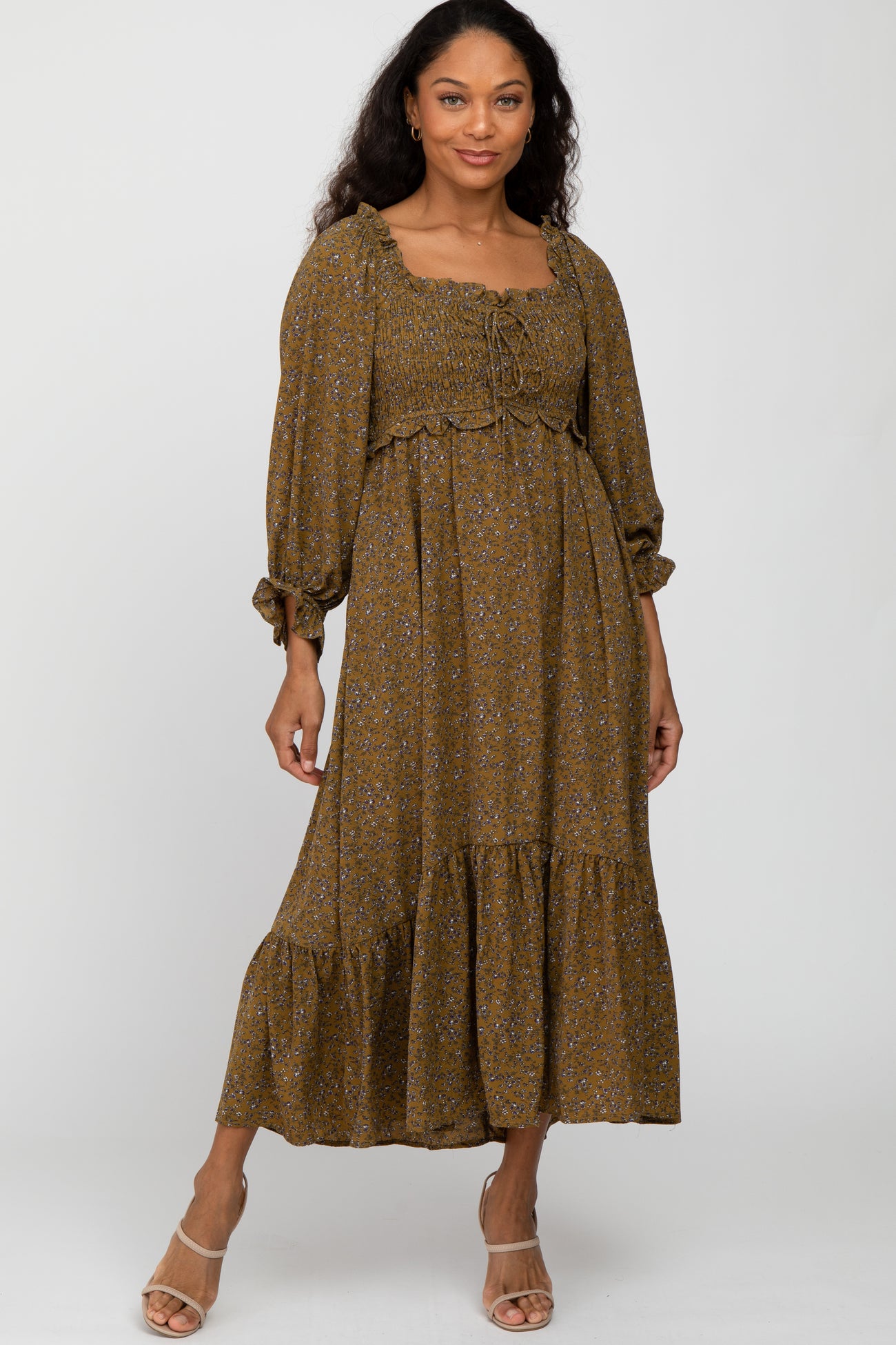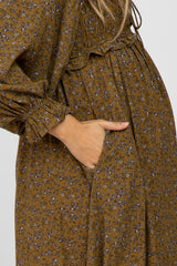 Olive Floral Ruffle Sweetheart Neck Maternity Midi Dress