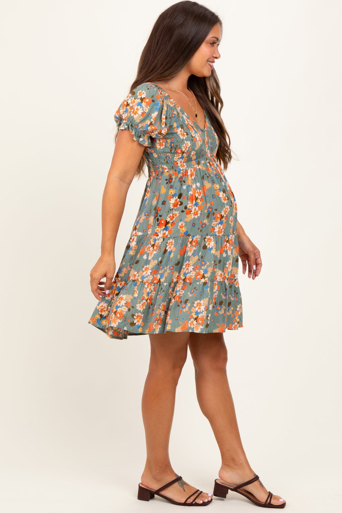 Olive Floral Smocked V-Neck Puff Sleeve Maternity Dress