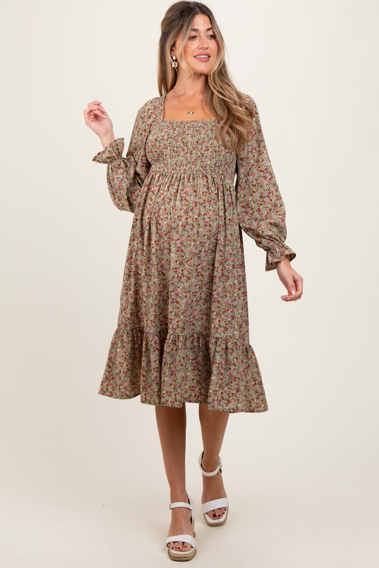 Embrace comfort and style with this smocked velvet maternity midi dress, designed to flatter your growing bump. The square neckline and delicate smocked bodice provide a secure yet flexible fit, while the long puff sleeves with gathered cuffs add a touch of elegance. The flowing skirt with a ruffled hem creates a feminine silhouette that moves gracefully with you. A back tie detail offers adjustable support and adds an extra hint of charm. Perfect for both casual outings and special occasions, this dress combines cozy fabric with a timeless floral pattern to keep you feeling beautiful throughout your pregnancy. Pair it with your favorite sandals or heels for a complete look.