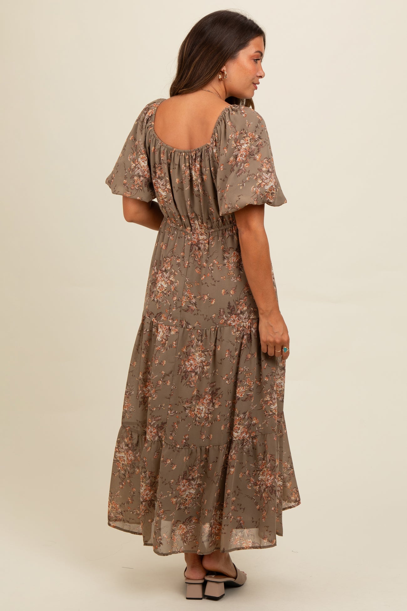 Olive Floral Tiered Puff Sleeve Maternity Maxi Dress