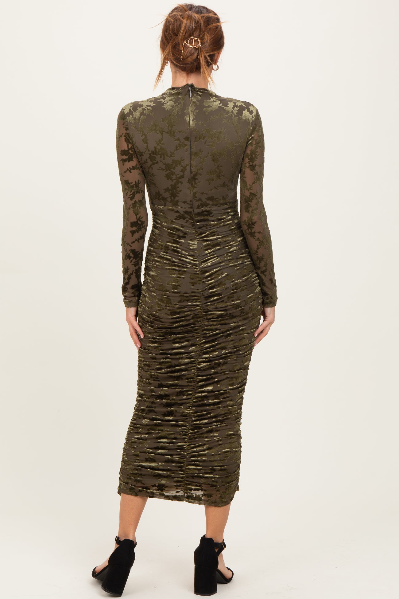 Olive Floral Velvet Mesh Ruched Midi Dress