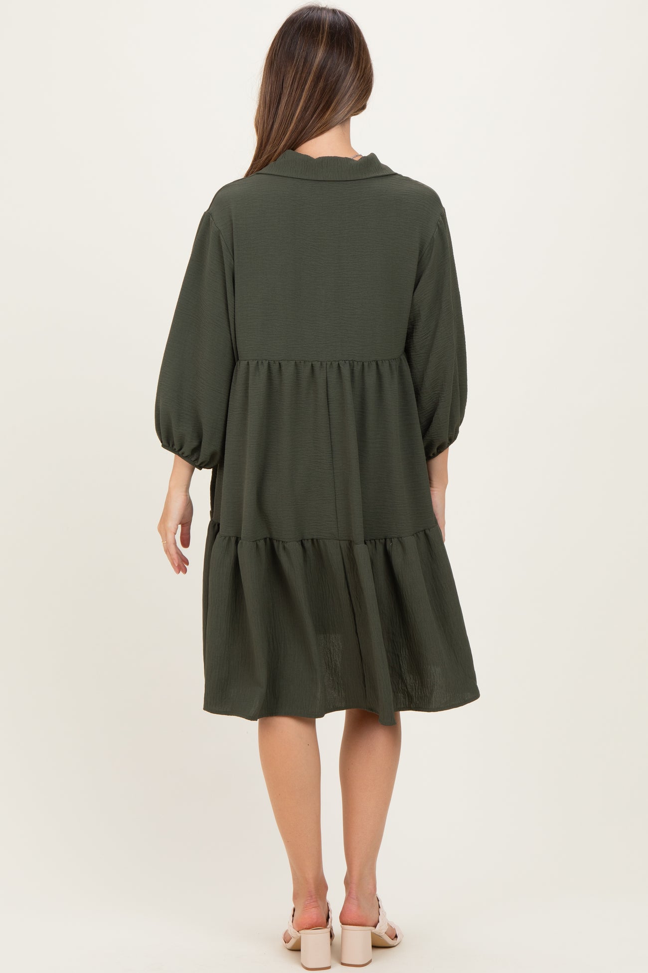 Olive Long Sleeve Button Down Collared Tiered Maternity Dress