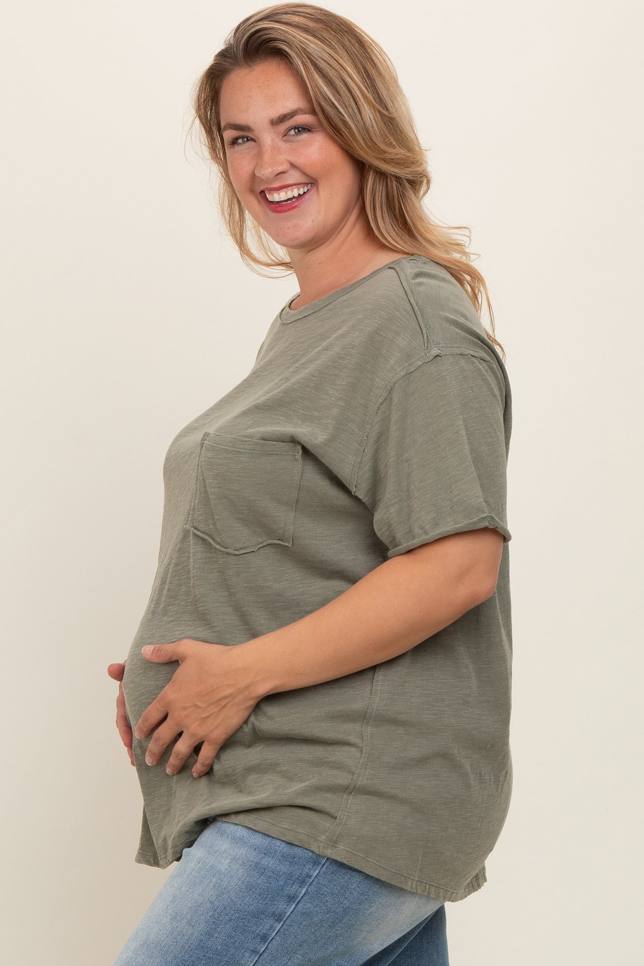 Olive Mineral Wash Front Pocket Short Sleeve Maternity Plus T-Shirt