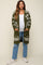 A printed open front maternity cardigan in a fuzzy knit material with two side pockets.