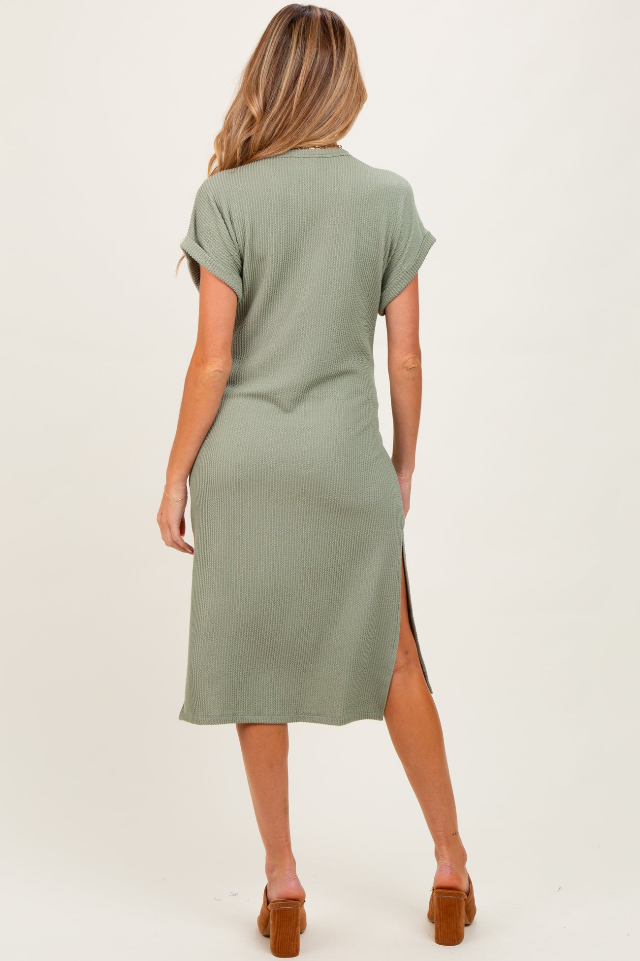 Stay effortlessly stylish and comfortable with our Olive Ribbed Short Sleeve Maternity Midi Dress. Made from soft, breathable ribbed fabric, this dress gently hugs your growing bump while providing plenty of stretch. The relaxed fit features a round neckline, short sleeves with a subtle rolled cuff, and side slits for ease of movement. Its midi length makes it perfect for any season and occasion, from casual outings to cozy nights in. Pair it with your favorite sandals or boots for an easy, chic maternity look that prioritizes comfort without sacrificing style. Machine washable for easy care.