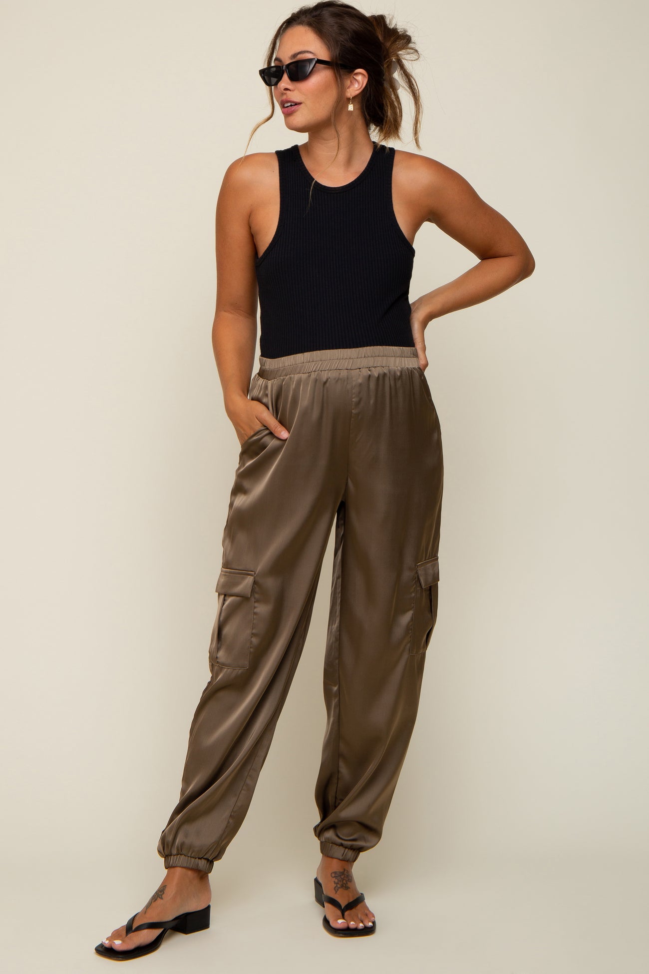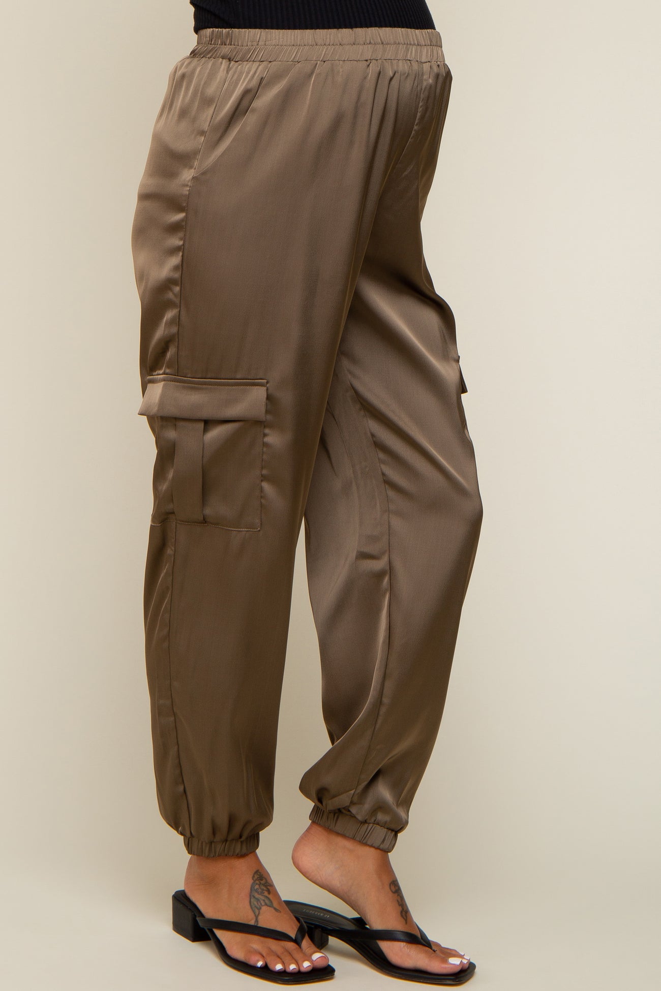 Details A satin maternity jogger pant with an elastic waistline, side pockets, and cargo pockets on the legs. Content + Care