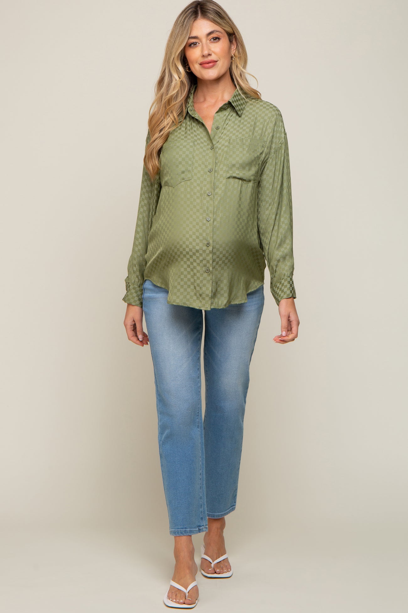 Olive Satin Checkered Button-Down Long Sleeve Maternity Top
