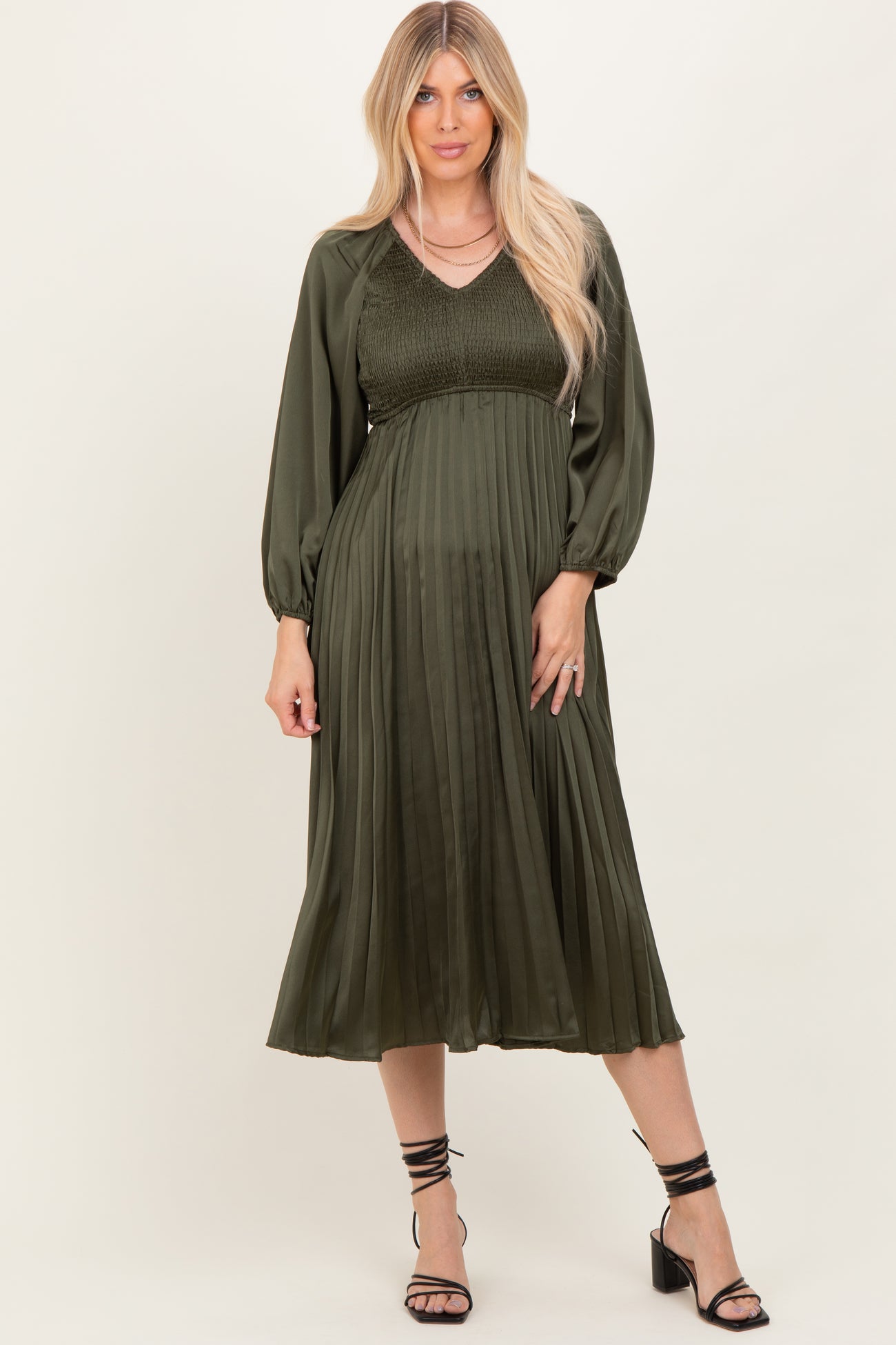 Elevate your wardrobe with this stunning Olive Satin Smocked Pleated Midi Dress. Crafted from luxurious satin fabric, this dress features a flattering smocked bodice that hugs your curves while offering comfort and flexibility. The elegant pleated skirt flows gracefully to a midi length, adding a touch of sophistication to your look. Long bishop sleeves with elastic cuffs balance the design with a chic, timeless appeal. Perfect for special occasions or stylish everyday wear, this dress pairs effortlessly with heels or flats. Available in a rich olive shade, it's a must-have for a refined, modern look.