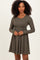 Olive Solid Ribbed Long Sleeve Crewneck Shirring Mini Dress