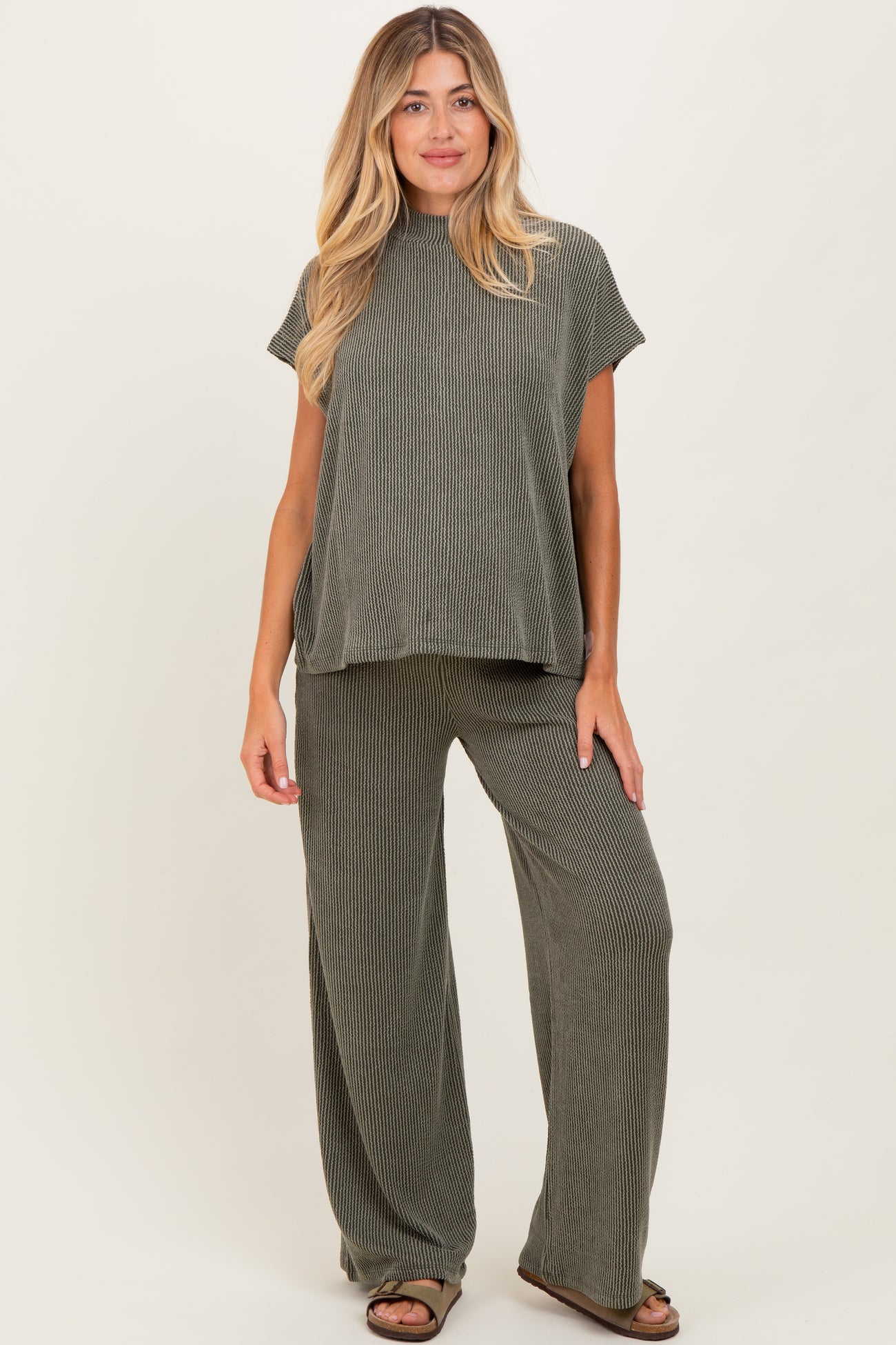 Olive Textured Rib Mock Neck Short Sleeve Pant Maternity Set
