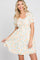 A floral embroidered lace dress with ruffle accents, cinched tie bust detail and puff sleeves. Pocketed. Dress is double lined.