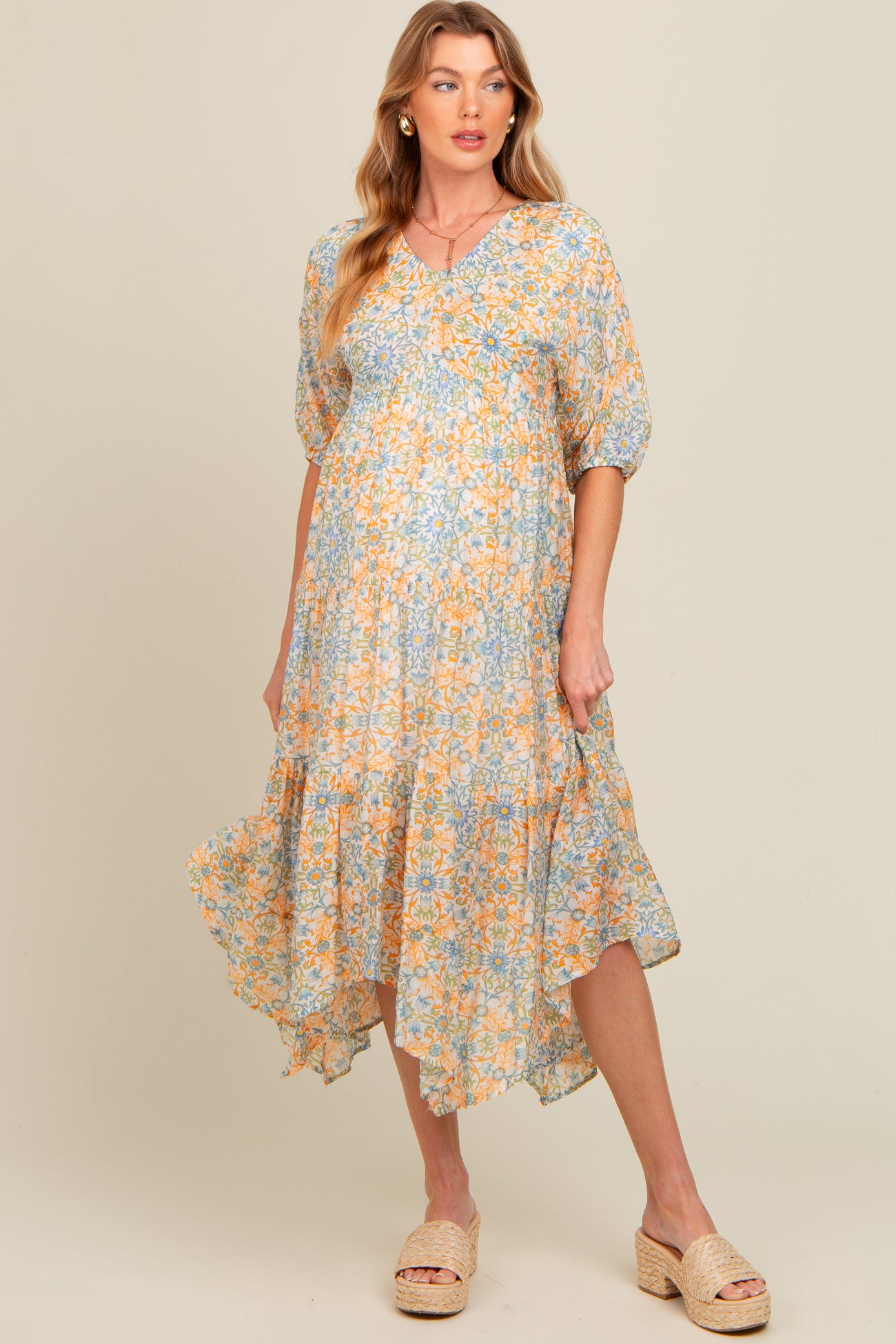 Orange Floral Border Print V-Neck Tiered Maternity Midi Dress