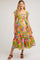 A floral maternity midi dress with a smocked top, short flounce cap sleeves, a waist tie, and a gathered bottom tier. Dress is fully lined.